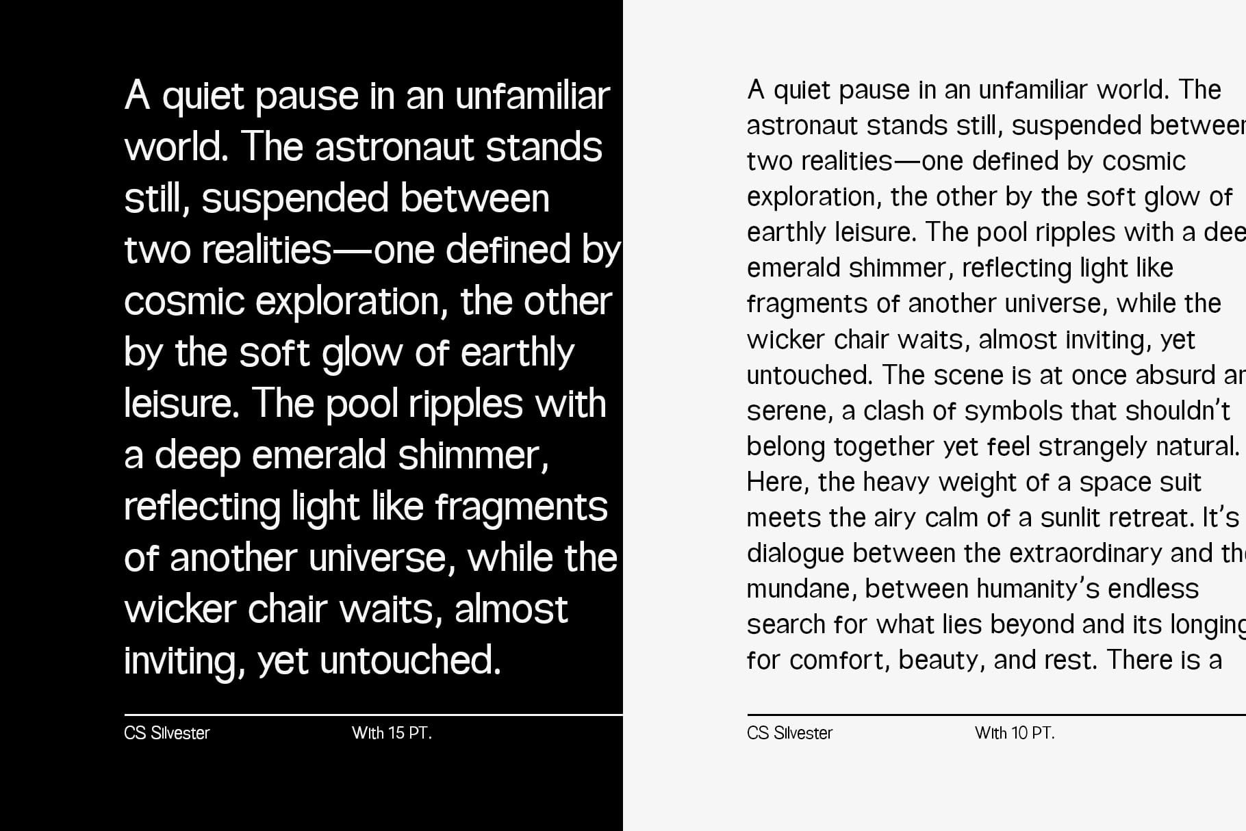 From web design and advertising to posters, logos, and experimental typography, CS Silvester offers endless versatility. Its geometric strength and Swiss-inspired style ensure that it can serve both corporate professionalism and creative exploration with equal impact.